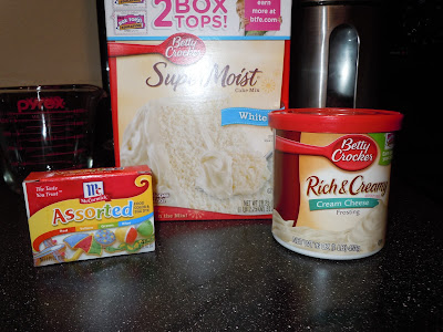 Start with a packaged white cake mix, cream cheese icing and food coloring. FYI - You will also need any additional ingredients that are on the back of the cake mix box. Mix the cake batter according to the instructions. Then divide into separate bowls depending on how many colors you want.