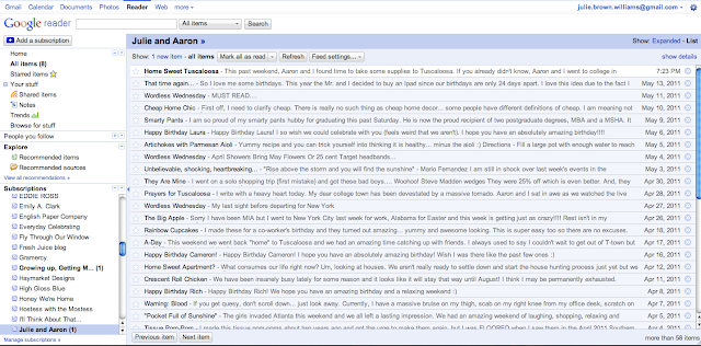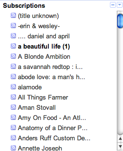 I currently subscribe to 99 blogs... You may think that is crazy but Google Reader makes them super easy to read. It pulls in a new post when it is published making this a one-stop shop for reading blogs.