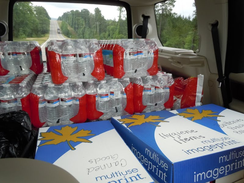 Aaron's new car got to haul some very important supplies like TONS of water, toiletries, diapers, canned food, etc.