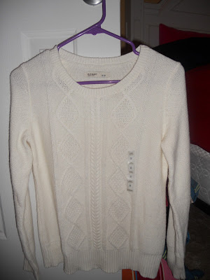 This sweater is so cute own is a creamy, ivory color. It is a great winter color and looked great with my skinny jeans and cognac boots! I wish this picture showcased the shirt as well as it wears! I got this for $13.