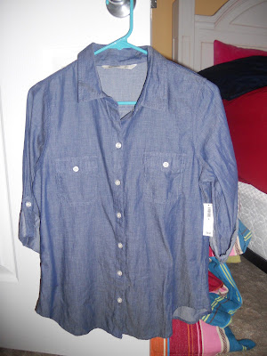 This picture doesn't do this shirt justice plus it got wrinkled in the bag! It is ON's chambray shirt...it is comfortable, fits well, and it may turn out to be my favorite chambray shirt I own! Got this for $18.