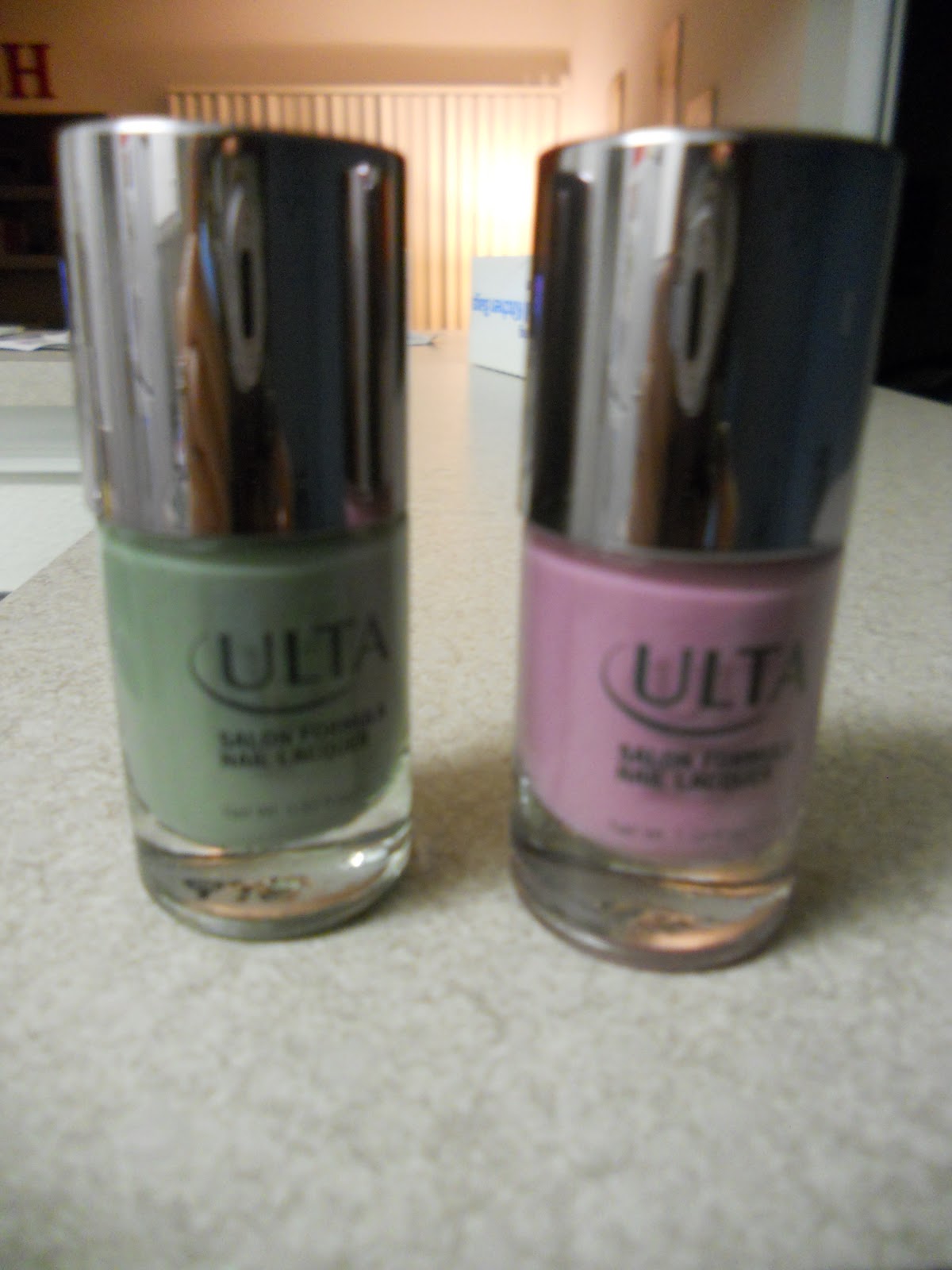 I also got these two! It was buy 1 get 1 free on Ulta products. The green is more of a deeper forest green and the other is a berry pink sort of...definitely looks like lavender in the photo!