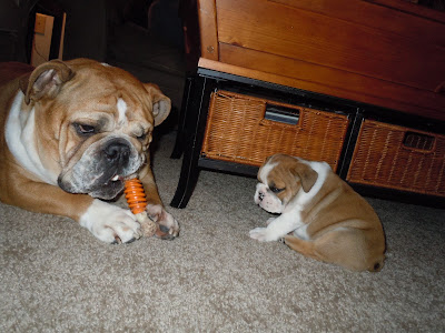How is Winston taking it, you ask? Well, he doesn't realize that his feet are the size of her head nor does he realize that when he loses her he should just look down... she is most likely hiding under his belly. Lately he just rests his head on her bed to see what she is doing or attempts to steal her toys when she isn't looking.