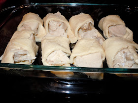 Cook the chicken if you haven't already done so; chop it up into smaller pieces. Unroll the crescent rolls. Divide the chicken between the eight rolls, and place in the pan like so.