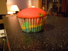 Drop the colors on top of each other into cupcake liners. Bake according to instructions.